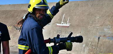 Feuerwehrleute auf der Insel São Nicolau üben dank der Mitglieder des Greater Manchester Fire and Rescue Service (GMFRS) neue lebensrettende Fähigkeiten mit der gespendeten Ausrüstung ein.